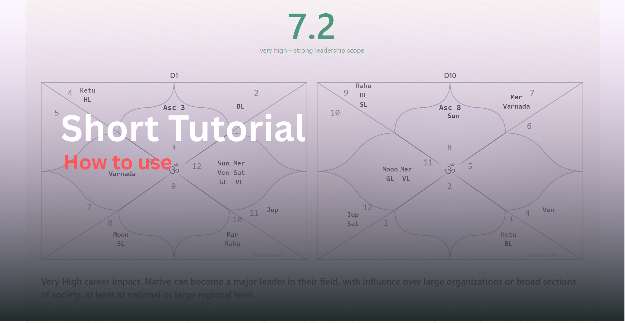 Parasara Jyotish is the most advanced vedic astrology software available on market for free. It not only displays your detailed chart details which is useful for astrologers but also analyses your chart. Although this is a very new software and many new features will come soon. Here you can explore your birth charts from D1 to D60 with all subtel details. You can explore what your chart says, What all yogas are formed in your chart, how do they impact you. You can also explore vimsottari dasha for your chart along with effects it will impose on you. Which is nothing but your horoscope in more accurate way. You can also have detailed insight about your career, marriage, education etc.